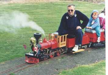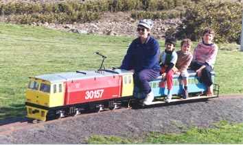 On October 3rd 2001 Train No 12 "DEXTER" the 7.25g DXR was put into service on the Thames Small Gauge Railway. It has been under construction for 6 months and is powered by twin 24volt 40amp EMD motors. 315AH battery capacity is housed under the long bonnet. Control of the motors is by two DS100 Dynamic System Controllers. Authentic diesel sound and horn is provided by an electronic sound board. This loco was pattened on the Tranz Rail DXR and painted in the Tranz rail colours. The 5" DH loco pictured beside the DXR looks rather small.