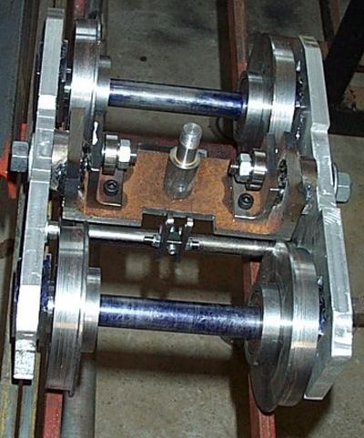 This shows the top and bottom view of the bogie. The side plates are 12 x 65mm aluminium bar with the usual horn slots and sprung axle boxes. The sides are mounted on a centre trunion with a centre pivot allowing the sides to twist independently of each other. The rollers on the trunion are set inside the wheel base. Each wheel has two ball bearings inside the wheel accounting for the large boss on the rear of the wheel. The axle is locked at one side in the axle box. (The other needs to rotate slightly to get the twist.) Brakes are fitted and will be actuated by a bowden cable.With the bogie sitting on the track any wheel can be raised 12-15mm without the others lifting and with no load other than the bogie.