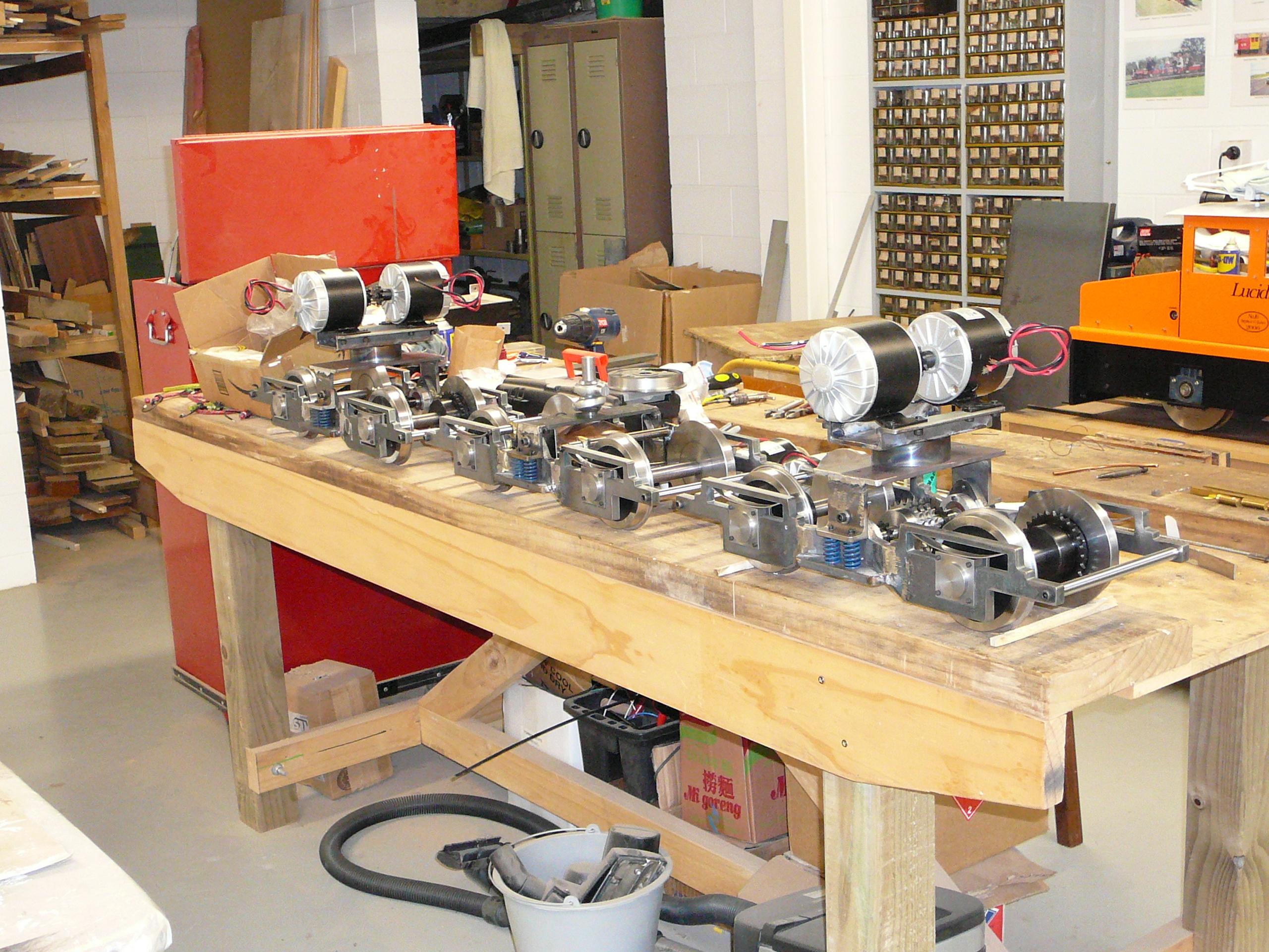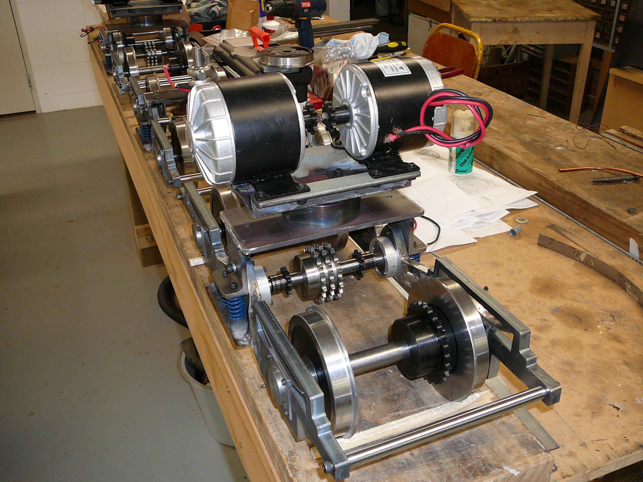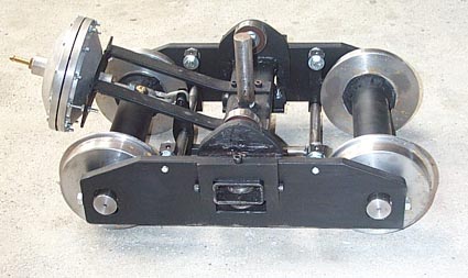The latest project is an electric articulated locomotive of the EW class. These had 3 BoBo powered bogies with the centre bogie being common to the front and rear units. In 5" gauge the bogies are shown. The two 300 watt motors are mounted above chassis and chain driven through the trunion. The front and rear bogies are identical with the centre common bogie having the train braking system.
