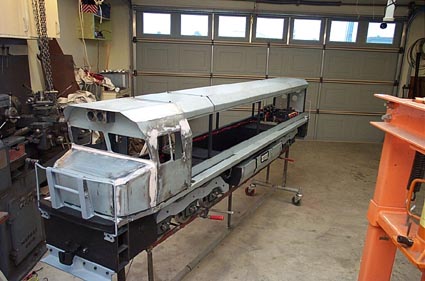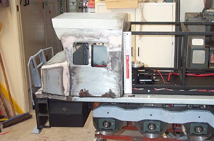 The cab is taking shape. It is to the new universal cab design being adopted by Tranz Rail as they replace the cabs on their locos. Notice the detailing along the sides of the bogies. The 300mm ruler gives some idea of the size. Just behind the cab is the vacuum pump. The vacuum storage cylinder is under the short bonnet.