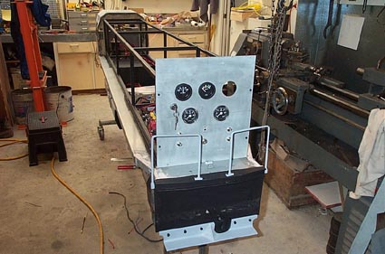 At the other end of the loco the control panel is taking shape. It incorporates ammeters, volt meter, vacuum gauges, switches, speedometer and socket for remote control. The top has yet to be shaped to fit under the long bonnet.