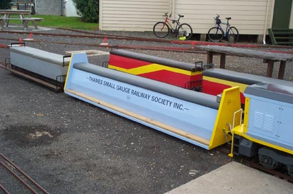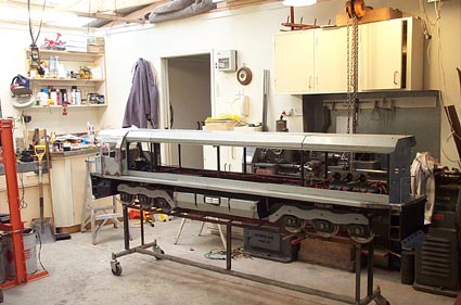 The bogies are powered by two 24v 40a EMD motors which drive the centre axle via a worm drive reduction. One of the motors is clearly seen in this picture.
