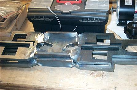 The bogie side plates were laser cut to my specifications from 12 mm mild steel plate. The centre recess for the springs was created by partially cutting the plates then bending into shape by hand before welding to keep the set.