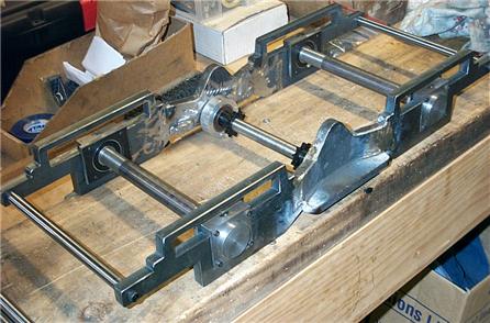 The bogie assembly showing side plates, end spacers axles and lay shaft for the chain reduction gears, Note the long slots above the axle boxes to accommodate the working leaf springs. The springs were made up of 4 leaves of 1mm x 12mm spring steel.