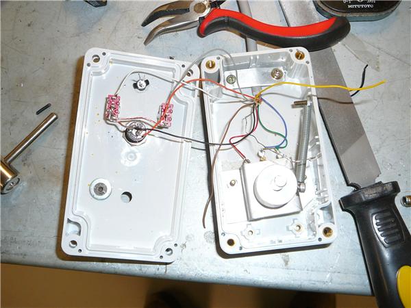 The control of the locomotive is via an umbilical chord to the hand control which houses the speed control, braking switches and horn. Here it is seen partly wired. Note the spring loading of the speed control to return it to zero automatically.