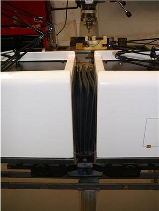 The pantographs are mounted on supporting stands over which the body sections will fit. Sitting on the platform in front of the stand supports is the actuating mechanism which has been created using a vacuum.