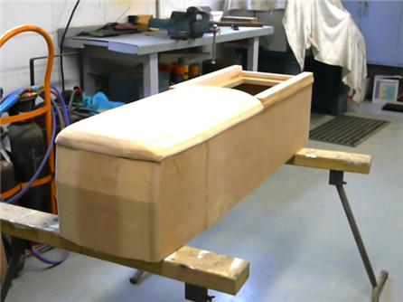 I decided to make the body shells from fibreglass due to the compound curves on the front. This meant making a pattern from custom wood first.This shows it under construction From the pattern a mould was made and from the mould two identical body sections were moulded..